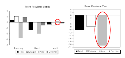 Retail trade sales were down 0.4 percent from March 2009 and 11.4 percent below last year. Gasoline stations sales were down 36.4 percent from April 2008 and motor vehicle and parts dealers sales were down 20.7 percent from last year.