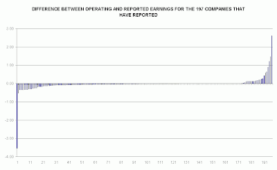 Misrepresentation in corporate earnings statements is rife; according to S&P, of the 197 SPX companies to report this quarter, only a quarter have actually earned the number reported in the headlines. Fully 63.5% stuffed "one-off" or "extraordinary" items in their income statements, while only 24 of the 197 had reported earnings that were higher than headline operating earnings. Interestingly, some of the latter were quite sizeable, courtesy of some of the worst performers of the whole crisis: Z-list financials, Ford, etc. The dispersion graph is shown below. [click on charts for larger views]