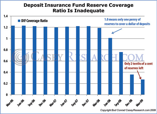 As you can see, the Federal Deposit Insurance Corporation currently covers each dollar on deposit with a trivial 2/10ths of a penny.