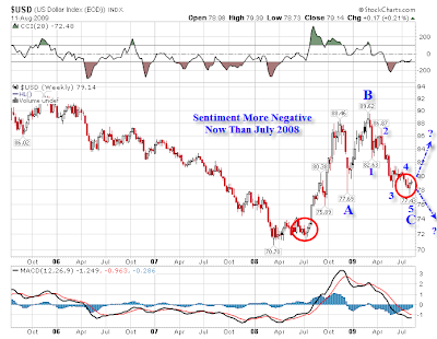 Note that bearish sentiment on the dollar is at an all time high even though the dollar index is substantially higher than it was in April and July of 2008. That’s bullish for the dollar.