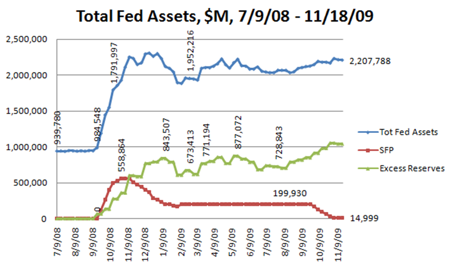 - SFP reduction and $268B of net printing the past 2 months: The "SFP", a program through which the US Treasury issued debt for the Fed to spend to blunt the inflationary impact of Fed balance sheet expansion, has led to tremendous money printing the past 2 months. Since 9/23/09, we’ve seen the SFP reduced by $185B and Fed Assets *increased* by $83B. In effect, then, the past 2 months have witnessed $268B worth of net printing of money by the Federal Reserve, without so much as a peep from the MSM (source).
