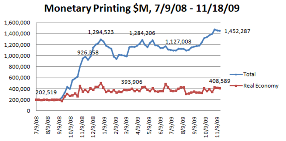 Fed B/S grew while SFP shrank – money printing. One would think, then, that this implies the Fed too is unwinding programs to scale itself down accordingly. Nope. In actuality, they have been *increasing* the size of their balance sheet. What we have seen since 9/23/09 is a reduction in the SFP from $200B to $15B, while the Fed has done nothing but increase Fed Assets from $2,125B to $2,208B. In other words, the SFP went down by $185B, while Fed Assets went up by $83B. In effect, the past 2 months have witnessed $268B worth of net printing of money by the Federal Reserve, without so much as a peep from the MSM.