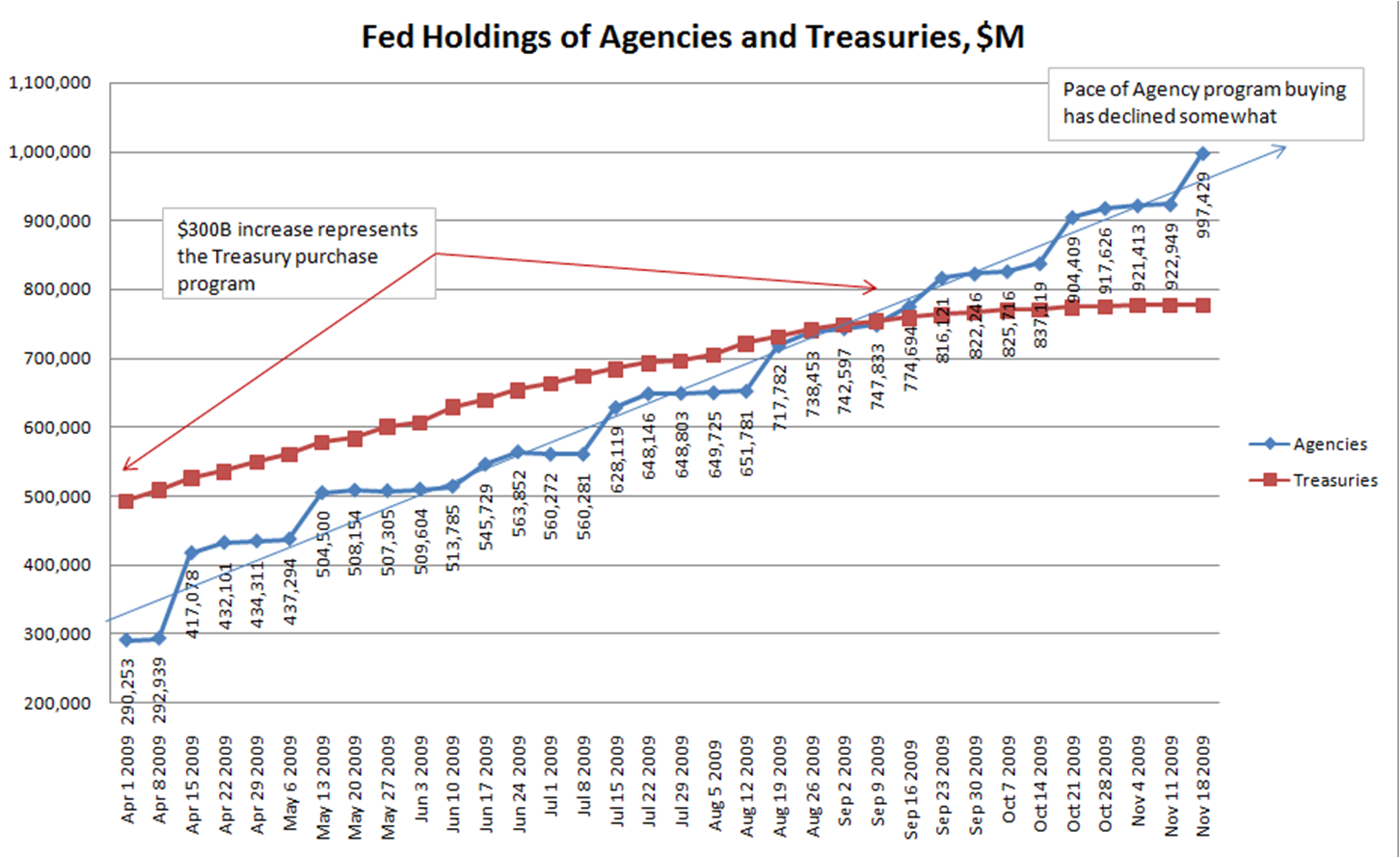 - Incremental purchases. The Fed bought an additional $250B of Agencies b/w 9/9/09 and 11/18/09.