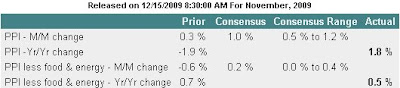 "We got the worst of both for this morning’s initial economic news. Producer prices surged while Empire manufacturing fell back sharply. Energy costs jacked up the headline PPI for November but the core also rose significantly. The overall PPI jumped 1.8 percent in November after gaining 0.3 percent in October. The boost in the latest month far exceeded the market forecast for a 1.0 percent increase. The November gain was led by a 6.9 percent spike in energy and a 0.5 percent gain for food. At the core level, the PPI rebounded 0.5 percent after a huge 0.6 percent drop in October. The market had projected a 0.2 percent rise for the latest month. It is easy to jump on the worry wagon about inflation from today’s report. But there should be a little caution about that. Oil prices have since come down and the jump in the core partly or mostly reflected getting back to near-term trend after October’s sharp drop. The core rebound was mainly for light trucks and cigarettes".