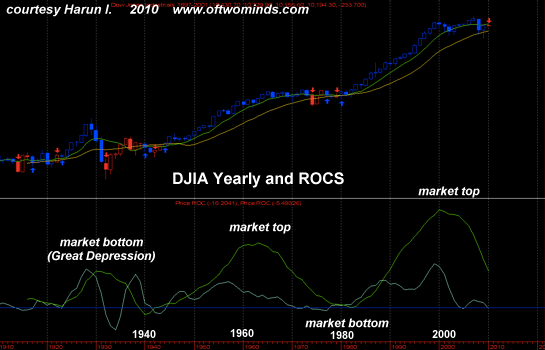 Frequent contributor Harun I. submitted several long term charts, one of total NYSE volumes and another of the percentage rate of change (PROC) of the Dow Jones Industrial Average (DJIA). These metrics provide a "beneath the surface" view of the market on a long-term scale which in effect smoothes out not just daily gyrations but weekly and monthly movements as well.