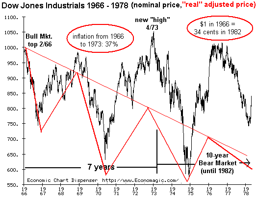 Interestingly, the notion that the market is a full decade away from a true bottom aligns with two other contexts: the Bear market of the 1970s lasted from 1966 to 1982, approximately 16 years in which "buy and hold" investors lost 2/3 of the value of their stock holdings even as nominal prices hovered around DJIA 1,000. (Inflation destroyed 2/3 of the purchasing power of their investments.)