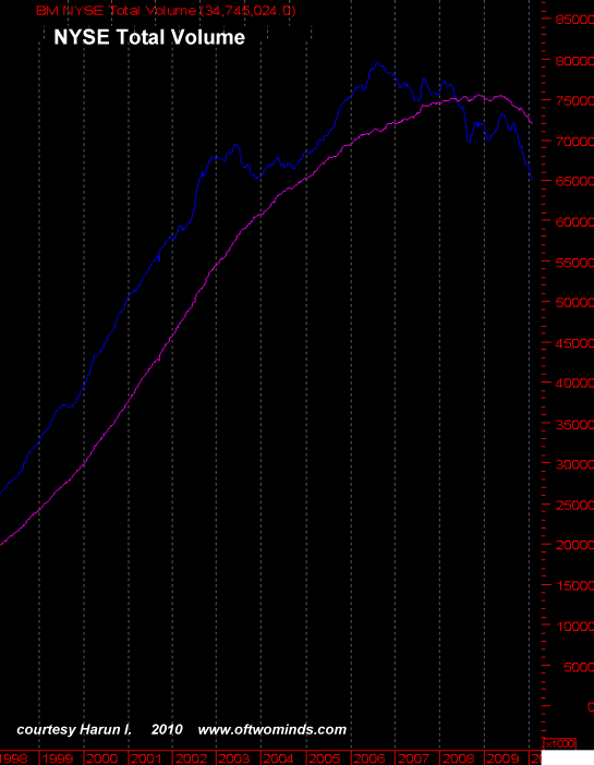 The Wall Street Truism has it that "volume is the weapon of the Bull." If so, this chart reveals that the Bull has been in retreat since 2006, and that the recent global rally is entirely lacking in volume and thus conviction.