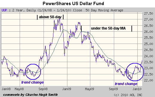 Yes, profits have skyrocketed from the depths of 2008 as corporations have slashed headcount and spending, but you can’t squeeze endlessly rising profits by harvesting the low-hanging fruit of cost-cutting; that’s essentially a one-off that’s already been done globally. To grow profits from here, corporations need sales growth. Any growth dependent on government stimulus is suspect because at some point that stimulus will decline or cease. Hence the uncertainty and sudden appreciation of forward risks to the "endlessly rising profits from endlessly rising sales" story.