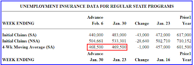 "In the week ending Feb. 6, the advance figure for seasonally adjusted initial claims was 440,000, a decrease of 43,000 from the previous week’s revised figure of 483,000. The 4-week moving average was 468,500, a decrease of 1,000 from the previous week’s revised average of 469,500."