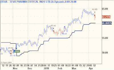 Below are two TEVA charts. The first one uses the standard Trend Model 2.0 and the second one uses my new beta version Trend Model 4.0 with wider settings that result in fewer trades at the expense of efficiency in both entry and exits. This will be a good test and example of how these two models differ in their approach to trend following.