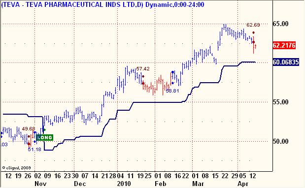 Under current parameters, TEVA triggered Short at the close Wednesday. Under the wider settings in the beta version of the Trend Model, a TEVA is still Long but will trigger Short on Daily close under 60.07. If the beta version it does trigger Short, it will represent a powerful confirmation of the first Short signal. Stop loss is at 63.94 according to the standard settings.