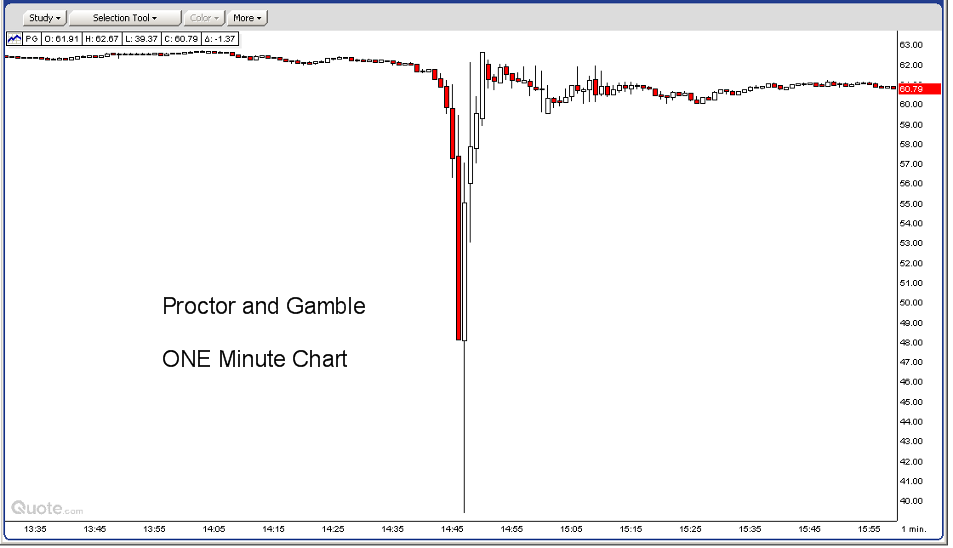 And as you might expect, the anchors on financial television are trying to excuse and blame the sell off on a ‘fat finger’ order that caused Proctor and Gamble to drop 20 points in 45 seconds. Or a typist inputting an order to sell 16 million e-mini SP futures, and typing "B" instead of "M." Oops. Crashed the free world.