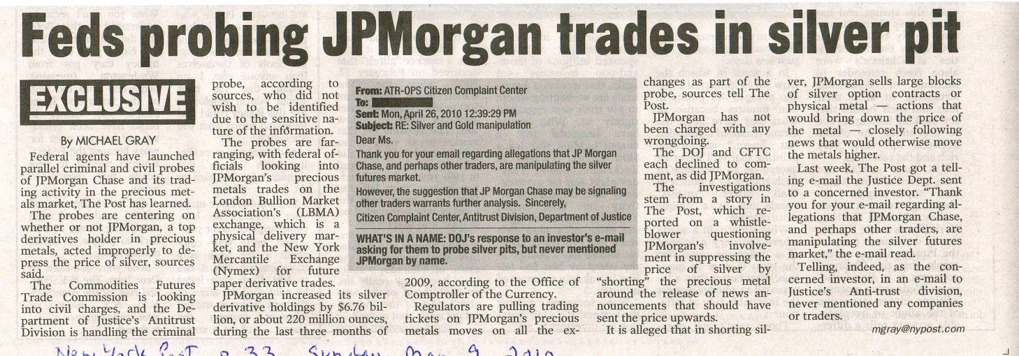 Last week, The Post got a telling e-mail the Justice Dept. sent to a concerned investor. "Thank you for your e-mail regarding allegations that JPMorgan Chase, and perhaps other traders, are manipulating the silver futures market," the e-mail read.