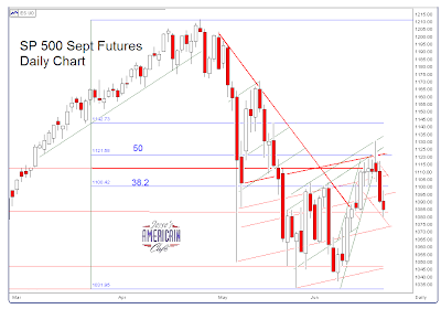 The Sept SP 500 Futures daily chart rolled over at big overhead resistance and has now fallen to support, retracing approximately 50% of its advance. Housing sales are falling dramatically according to this morning’s economic reports.