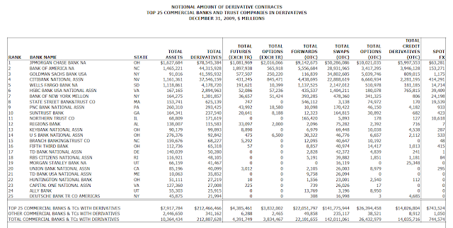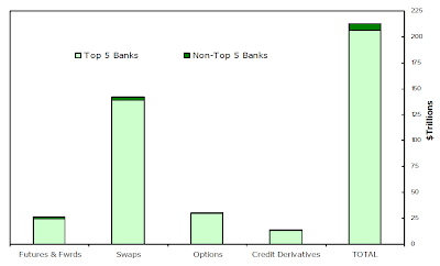 Now might be a good time to introduce a handy chart that shows the latest OCC data on derivatives exposure, or, more specifically, shows the concentration of said derivatives exposure among FIVE banks. You know, that would be the five banks that Blanche Lincoln might have wanted to target with this "reform" plan of hers. Just sayin, cue chart: