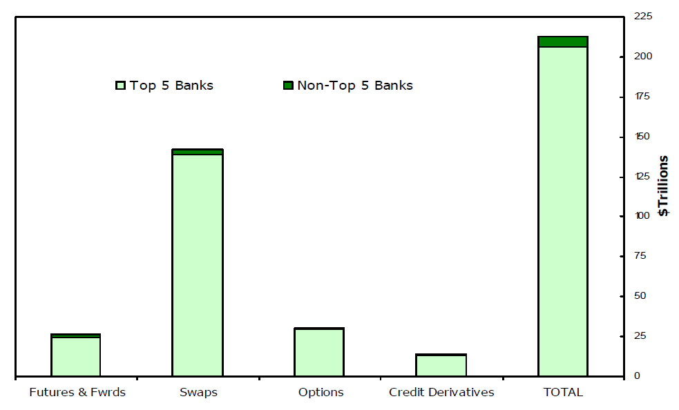 - Derivatives contracts are concentrated in a small number of institutions. The largest five banks hold 97 percent of the total notional amount of derivatives, while the largest 25 banks hold nearly 100 percent.