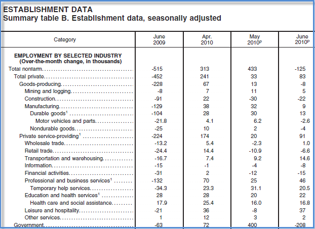 Please consider the Bureau of Labor Statistics (BLS) June 2010 Employment Report.