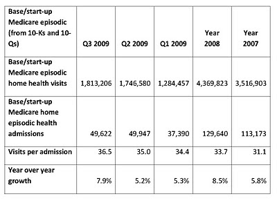 In Q4 2009, base/start-up Medicare episodic visits per admission suddenly began to decline, falling to 35.2 visits per admission compared to 36.5 visits per admission in Q3 2009, It was the first Q4 v Q3 sequential decline in base/start-up Medicare episodic visits per admission since 2006. See the chart below:
