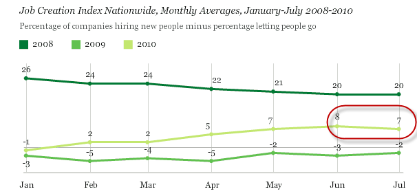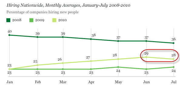 In July, 28% of U.S. workers reported that their companies were hiring, halting the consistent upward trend found from February to June. From a longer-term perspective, hiring reports are up substantially from the same period in 2009, but still below hiring levels at this time in 2008.