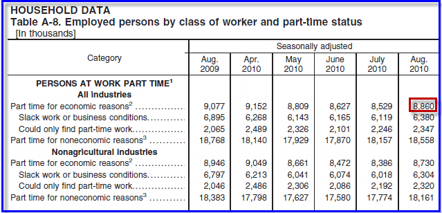 The official unemployment rate is 9.6%. However, if you start counting all the people that want a job but gave up, all the people with part-time jobs that want a full-time job, all the people who dropped off the unemployment rolls because their unemployment benefits ran out, etc., you get a closer picture of what the unemployment rate is. That number is in the last row labeled U-6.