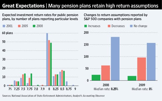 Many plans have held onto an 8% return expectation though thick and thin. Such return assumptions partly reflect the heady years of the 1990s bull market. Public pension plans posted a median, annualized return of 9.3% over the past 25 years, but just 3.9% over the past 10, according to consulting firm Callan Associates.The Oregon Public Employees Retirement System has had an 8% assumption since 1989. Its actual return averaged 10.7% annually from 1970 through 2009. The Teachers Retirement System of Texas has had a similar expectation since 1986, with an annual return of 9% return since then.