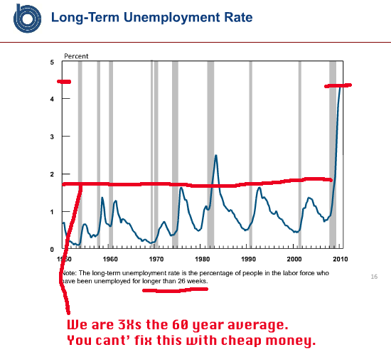 That is not a coincidence. The long-term nature of unemployment we face today is structural. We have exported too many jobs. You can’t fix that problem overnight. And you can’t fix it with another jolt of short-term monetary stimulus. As Philadelphia Fed’s Charles Plosser said this week: