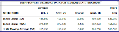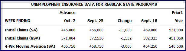 In the week ending Oct. 2, the advance figure for seasonally adjusted initial claims was 445,000, a decrease of 11,000 from the previous week’s revised figure of 456,000. The 4-week moving average was 455,750, a decrease of 3,000 from the previous week’s revised average of 458,750.