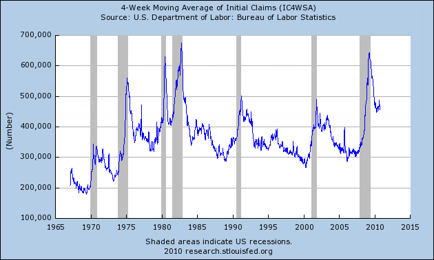To be consistent with an economy adding jobs coming out of a recession, the number of claims needs to fall to the 400,000 level.
