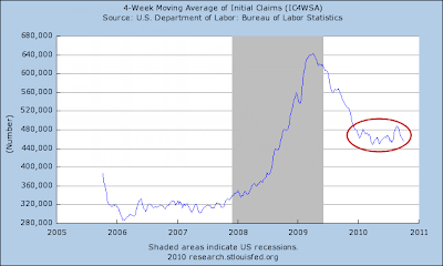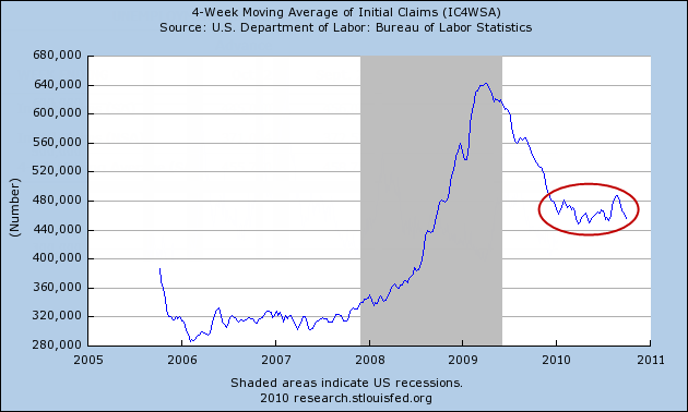 The 4-week moving average has ticked down for a few weeks but the number is nothing to crow about. Moreover, claims have been generally in 450,000 range for 10 straight months of sideways movement so we can easily see more of the same. I am still expecting lots of state cutbacks so that could have an impact. Finally, the holiday shopping season is now just around the corner. It will be interesting to see what that portends.