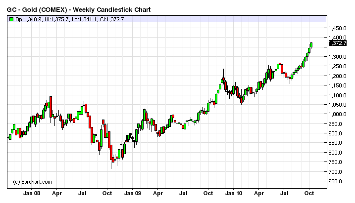 Gold is up another $25 today and has been on a tear ever since late 2008.