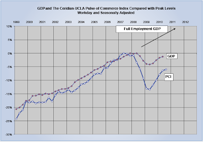The PCI began 2010 strongly with growth of the first quarter compared with the fourth quarter of 2009 equal to 9.7% at an annualized rate. But the second quarter growth compared with the first was 6.2% annualized, and now the third quarter is only 2.1% above the second. In other words throughout the year, growth of the PCI has moved inexorably less and less, edging toward zero.