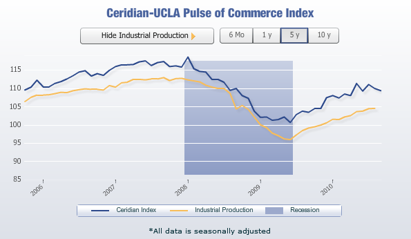 The Ceridian-UCLA Pulse of Commerce Index™ (PCI), a real-time measure of the flow of goods to U.S. factories, retailers, and consumers, fell .5 percent in September after falling 1.0 percent in August, which is the first time the index has experienced a consecutive monthly decline since January 2009. Furthermore, August and September 2010 together produced the worst combined two-month decline since the recessionary months of January and February 2009.