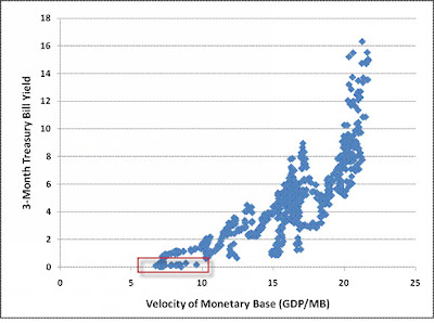 Few theoretical relationships in economics hold quite this well. Recall that a Keynesian liquidity trap occurs at the point when interest rates become so low that cash balances are passively held regardless of their size. The relationship between interest rates and velocity therefore goes flat at low interest rates, since increases in the money stock simply produce a proportional decline in velocity, without requiring any further decline in yields. Notice the cluster of observations where interest rates are zero? Those are the most recent data points.