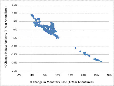 You can see why monetary base manipulations have so little effect on GDP by examining U.S. data since 1947. Expand the quantity of base money, and it turns out that velocity falls in nearly direct proportion. The cluster of points at the bottom right reflect the most recent data.