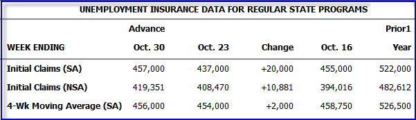 In the week ending Oct. 30, the advance figure for seasonally adjusted initial claims was 457,000, an increase of 20,000 from the previous week’s revised figure of 437,000. The 4-week moving average was 456,000, an increase of 2,000 from the previous week’s revised average of 454,000.