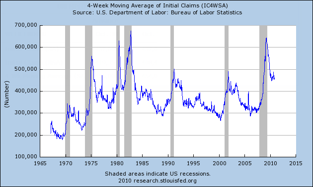 There has been no lasting improvement for nearly a year. Weekly claims have generally been in the 440,000 to 480,000 range with the 4-week moving average practically pinned to the 450,000 mark.