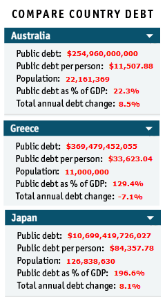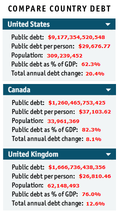 I am confused with the Global Debt Clock, as reflected on your article from The Economist. I have copy of an article from The Washington Post, dated several months ago, reflecting Government debt in percentage of nominal gross domestic product. The table was reproduced from Organization for Economic Cooperation and Development, the comparison is as follows: