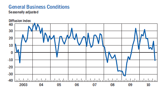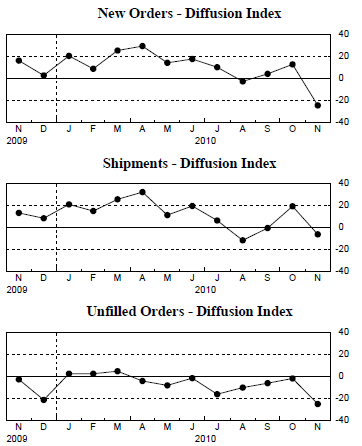 The general business conditions index fell below zero for the first time since July of 2009, dropping a steep 27 points to -11.1—an indication that, on balance, conditions had worsened over the month. The percentage of respondents reporting that conditions had improved fell from 35 percent in October to just 17 percent in November, while the percentage reporting that conditions had worsened rose from 20 percent to 28 percent.