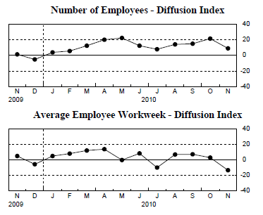 The indexes for both prices paid and prices received declined, with the latter falling into negative territory. The index for number of employees remained above zero but was well below its October level, and the average workweek index dropped to -13.0.