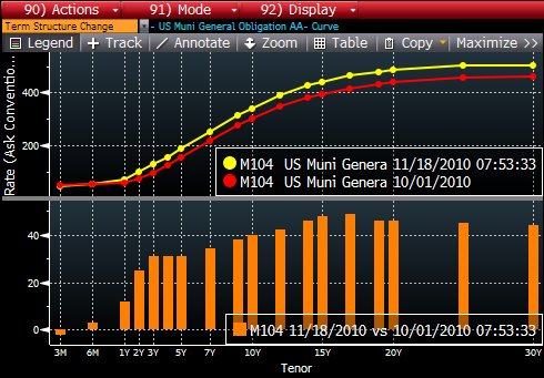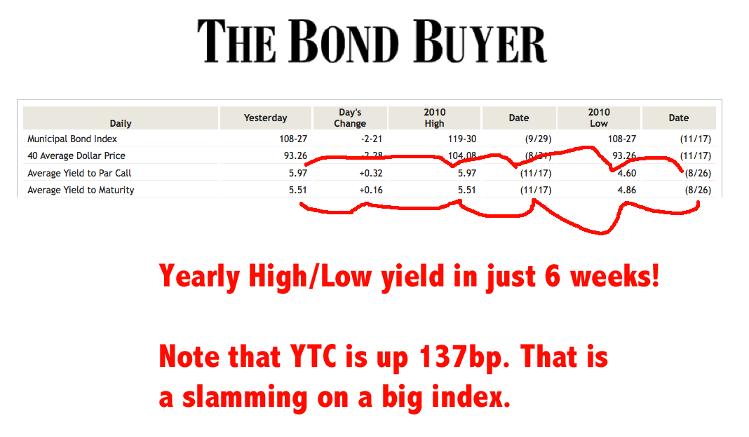 Speaking of sovereign blowups there is one happening in the US Muni market. There are a number of factors hitting Muni’s of late. Some are technical, some yield curve related. But there is more happening than just these things. It reminds me a bit of what happened to Ireland before they were forced to fold. Some things hanging on the market: