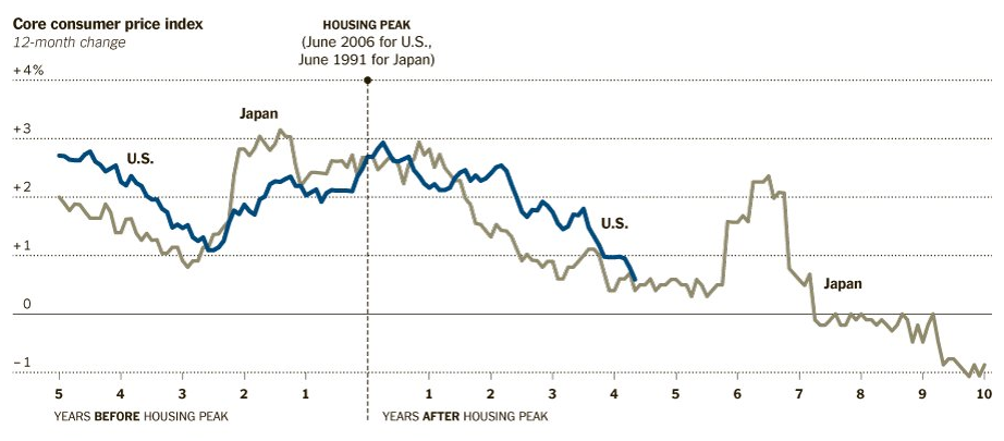 I have been saying for 5 years the US would follow the path of Japan. An interesting chart in the New York Times shows this is indeed what has happened.