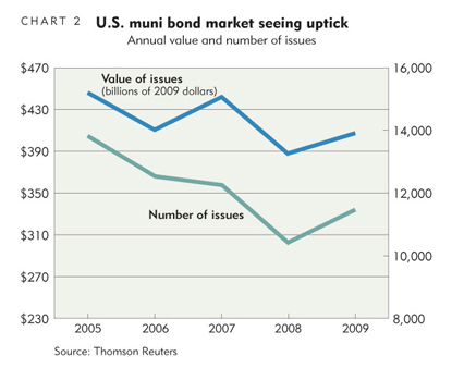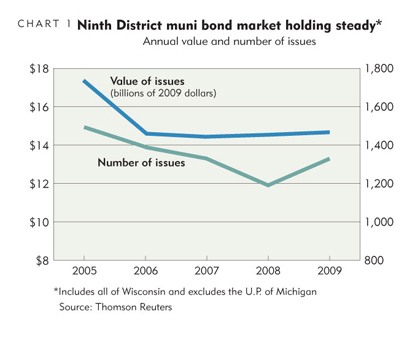 Last year, the value of municipal bonds issued in the Ninth District rose by just 1 percent; since 2006, annual values (inflation-adjusted) have been table-top flat. Gains were higher last year at the national level, though annual levels over the past few years have been more volatile compared with the Ninth District.