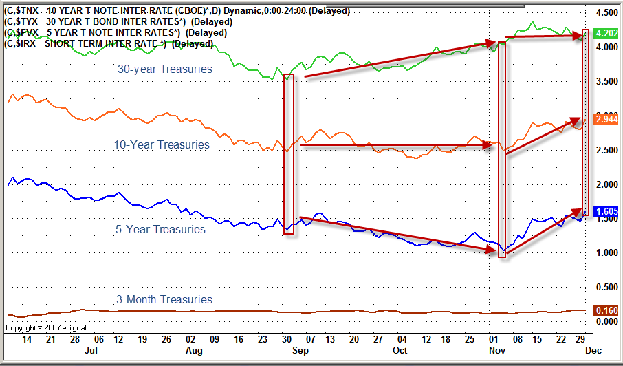 Since early November, 5-year treasury yields have risen about 60 basis point, 10-year yields about 45 basis points, and 30-year treasury yields have risen perhaps 5 basis points.