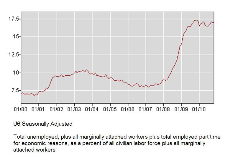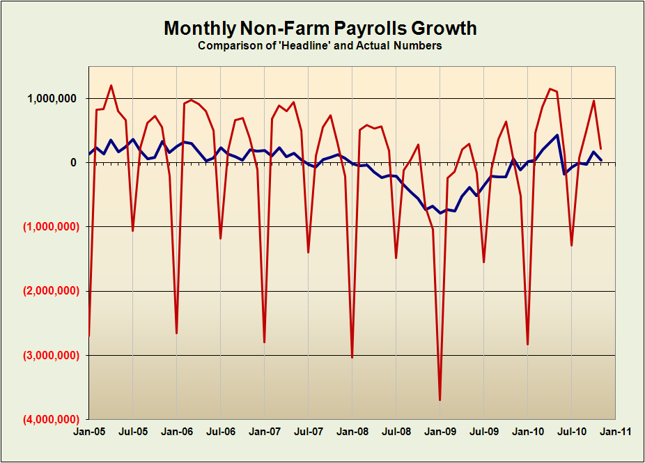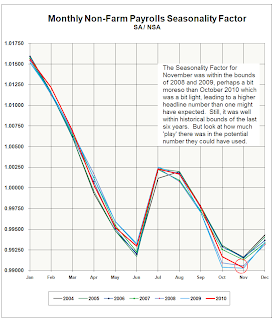 Looking at the historical Oct-Nov growth in the unadjusted numbers for the past six years shows a clear downward trend from the high in November 2005, with the low coming in November 2008. The growth as it stands in 2010 is roughly the same as it was in 2004, although the 2010 numbers will likely be revised in the next two reports.