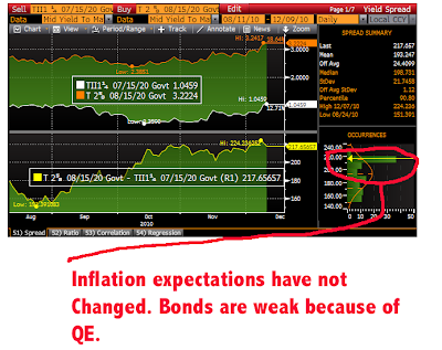 What’s driving the back up in the bond market? Inflation? Inflationary expectations? If that were the case Bernanke would be pleased. Increasing inflationary expectations is a primary goal of QE. How is he doing on that score? Lousy. The chart on TIPs since QE2 was announced.