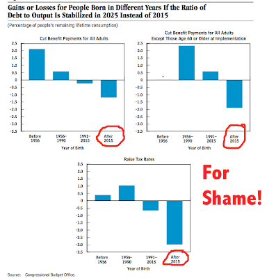 The conclusions from the report are not all that surprising. Our economy and society will be screwed if we delay in getting our house in order. What else is new? There was one chart from the report that struck me hard. The CBO did an analysis of which age groups would be most affected by kicking the can down the road policies. So who is going to be hurt the most? Children that will be born after 2015. The kids who are not even close to being a twinkle in one’s eyes are going to pay for what we are doing today.
