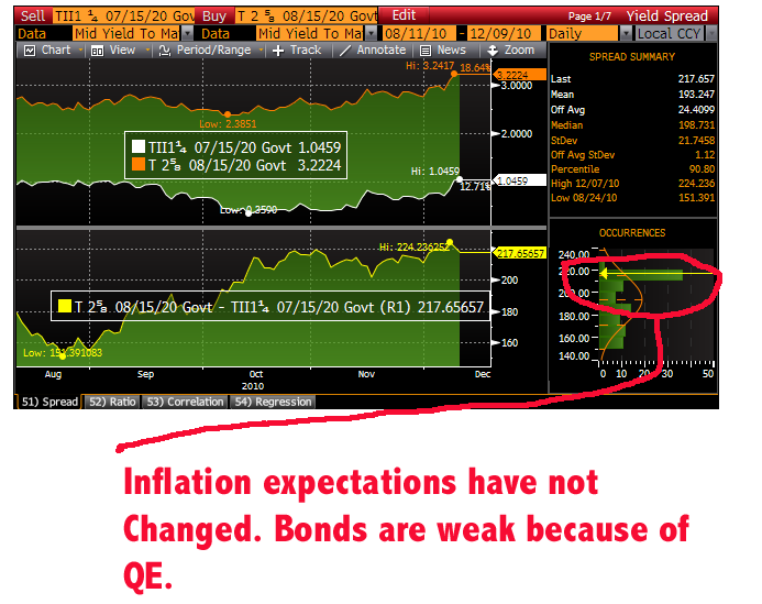 What’s driving the back up in the bond market? Inflation? Inflationary expectations? If that were the case Bernanke would be pleased. Increasing inflationary expectations is a primary goal of QE. How is he doing on that score? Lousy. The chart on TIPs since QE2 was announced.