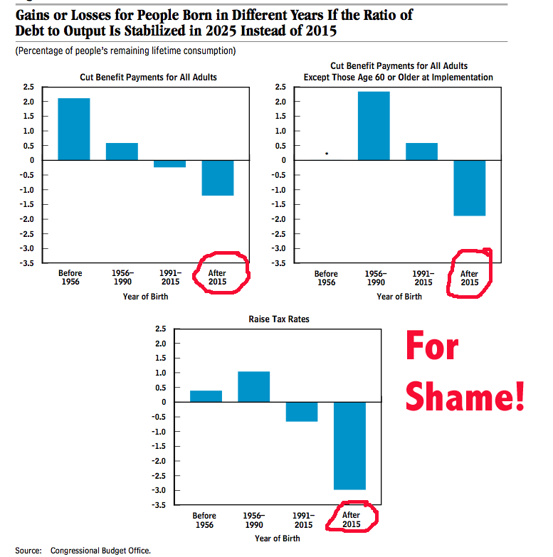 The conclusions from the report are not all that surprising. Our economy and society will be screwed if we delay in getting our house in order. What else is new? There was one chart from the report that struck me hard. The CBO did an analysis of which age groups would be most affected by kicking the can down the road policies. So who is going to be hurt the most? Children that will be born after 2015. The kids who are not even close to being a twinkle in one’s eyes are going to pay for what we are doing today.