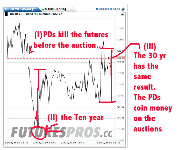A quick look at a two-day chart of the bond futures. Just before the tens and thirty year auction the market (aka the primary dealers) took bond prices down by a chunk. My scribbles on this chart show the timing of the actual results of the auctions. In both cases you see a spike up in bonds post the announcement. Yields returned to the level before the market smack down an hour or so after the auctions were finished.