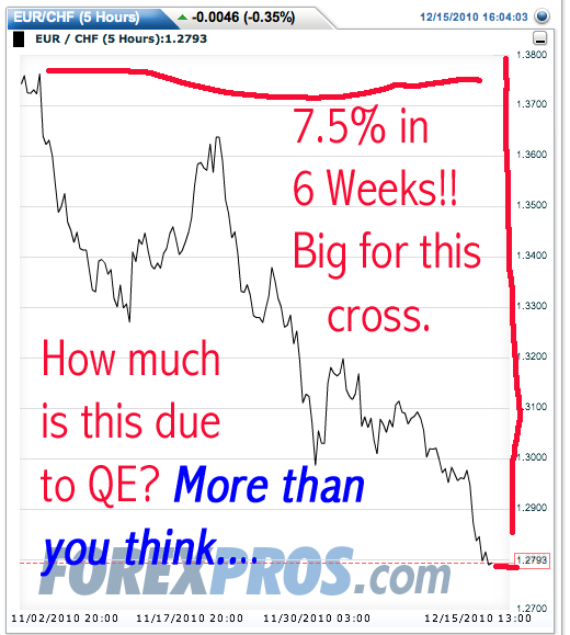 It is easy to blame all of the weakness in the EURCHF on the ongoing circus in Disney Euro Land. But I think there is more to the story. The recent meltdown in the cross started on 11/3/2010, the day that QE-2 became a reality (surprised?). I never have believed in coincidences, this time is no exception.